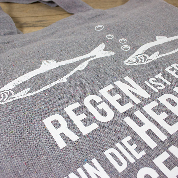 Aufdruck: "Regen ist erst, wenn die Heringe auf Augenhöhe vorbeischwimmen."