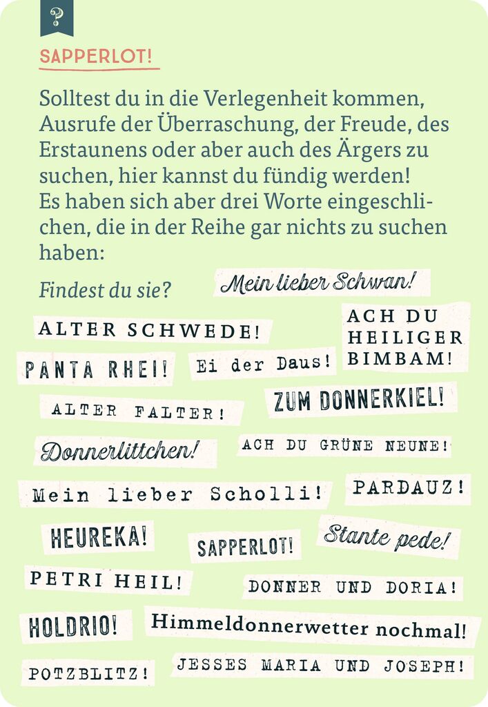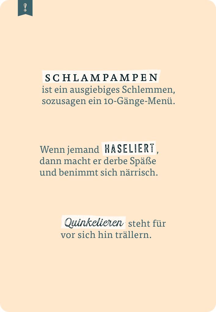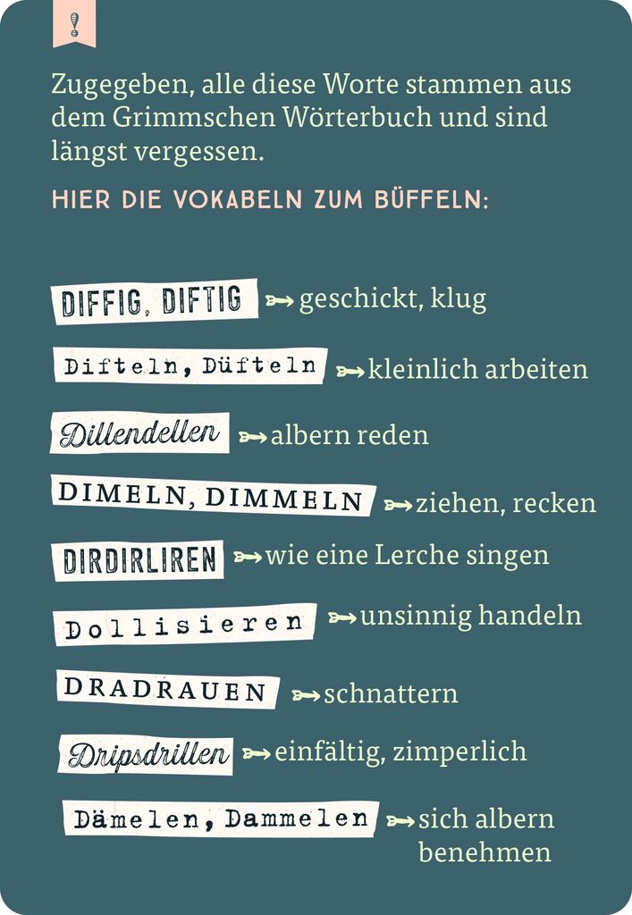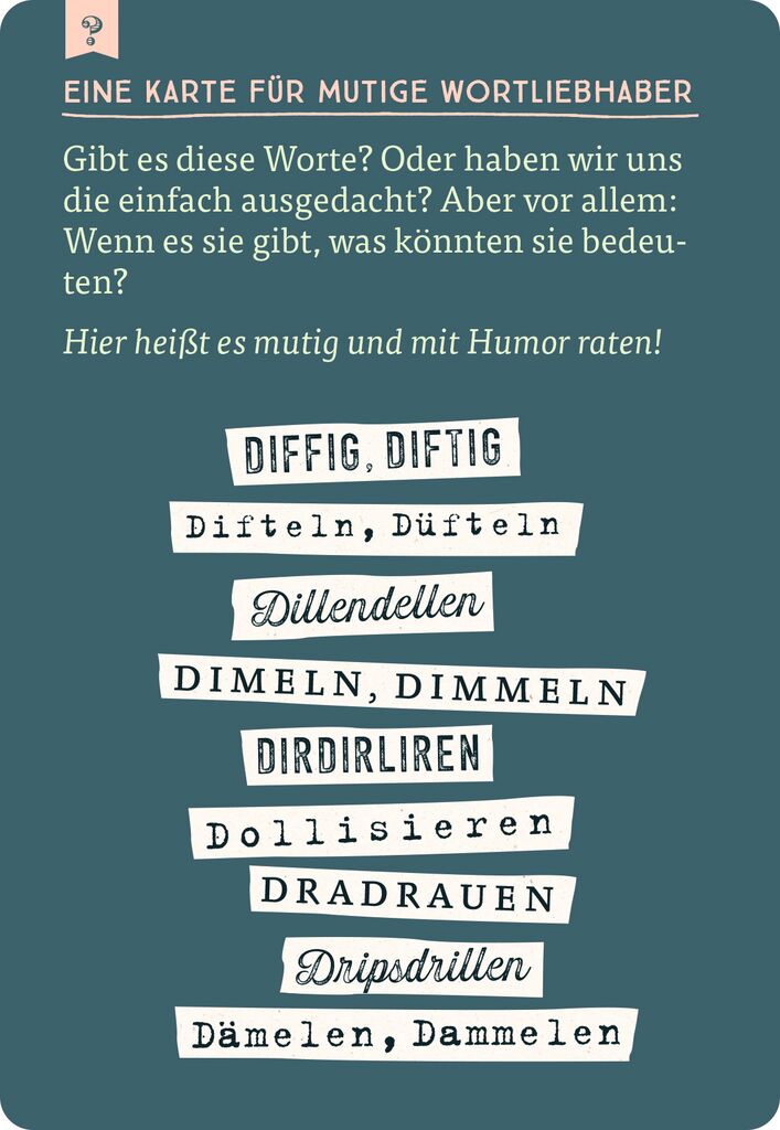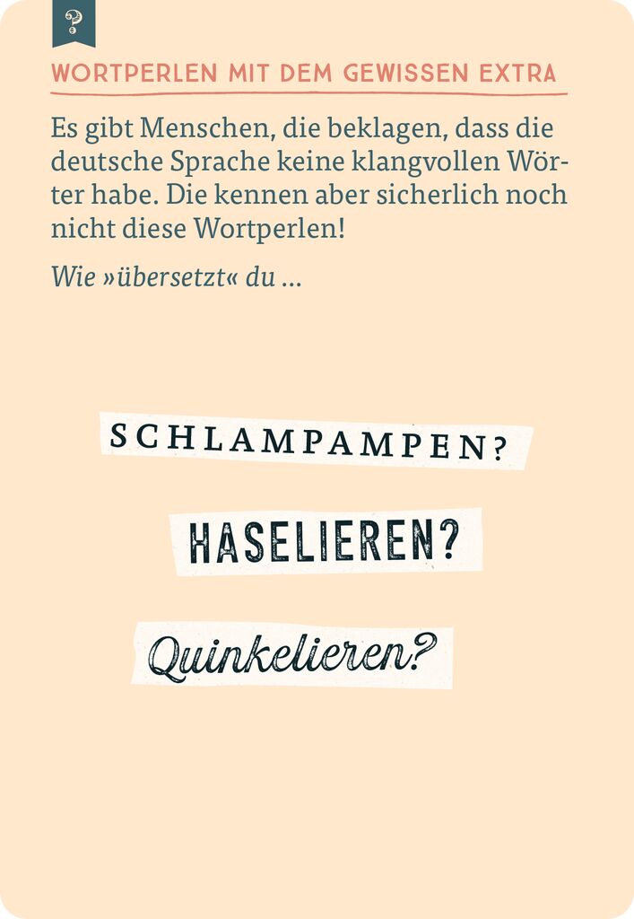 lädt ein zu einer nostalgischen Reise zu den Begriffen, die wir vermissen werden! Dieses Quiz erinnert auf 75 handlichen Karten an besondere „Wortperlen“, die schön klingen, einzigartig sind und so einiges verblüffend treffend ausdrücken. Dabei befördert das Quiz Wörter zu Tage, die trotz jahrhundertelanger Benutzung aus dem täglichen Sprachgebrauch verschwunden sind: Brimborium, Chuzpe, Dripsdillen, Haselieren, Müßiggang, Portjuchhe, Schlendrian, Tausendsassa, Wonne. Wer ist ein wahrer Wortakrobat und kennt sich mit den Schätzen der deutschen Sprache aus? Potzblitz und ei der Daus, ist das ein Rätselspaß! Das Quiz ist das perfekte Geschenk für eloquente Menschen und alle, die Freude an der deutschen Sprache haben.