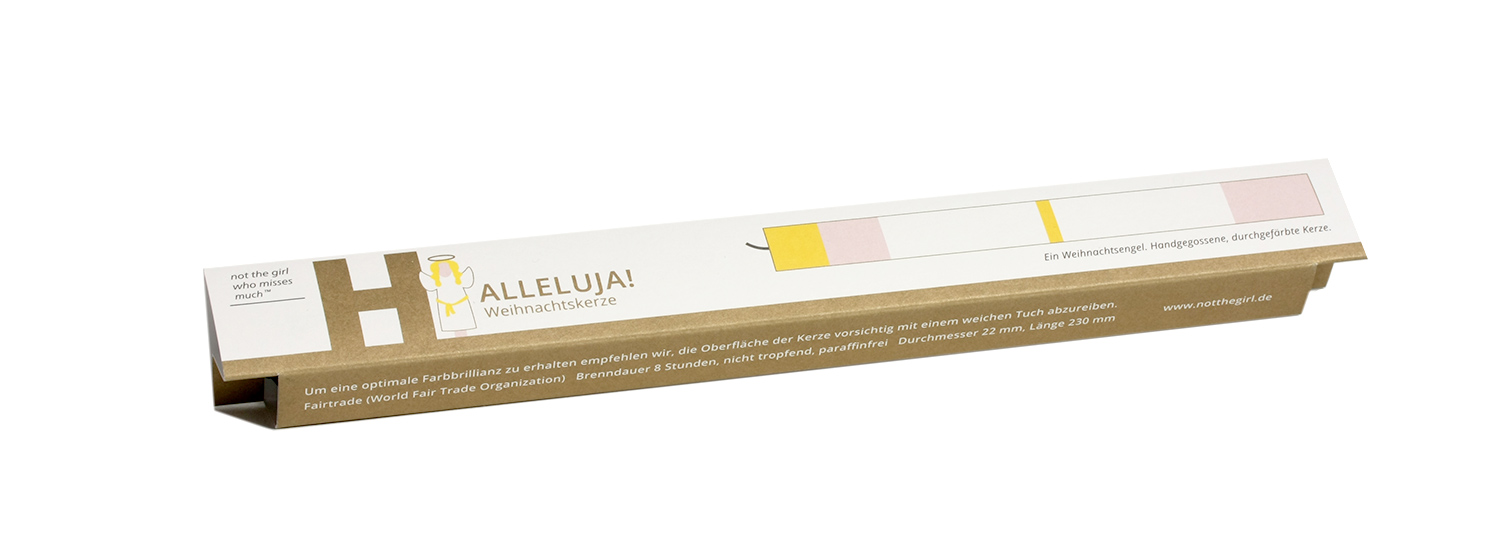 Ein Geschenk, Glückwunsch oder ein Gruß – jedes Thema findet seine passende Kerze, einzeln in einer farbigen Kartonage verpackt. Die Kerze besteht aus durchgefärbtem Wachs – aufwendig wird bei ihrer Fertigung Farbschicht für Farbschicht von Hand gegossen.Die Verpackungen werden in Hamburg klimaneutral auf FSC zertifiziertem, offenen Designpapier gedruckt und weiterverarbeitet.