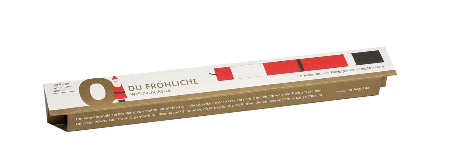 Santa Clause, O Du FröhlicheEin Geschenk, Glückwunsch oder ein Gruß – jedes Thema findet seine passende Kerze, einzeln in einer farbigen Kartonage verpackt. Die Kerze besteht aus durchgefärbtem Wachs – aufwendig wird bei ihrer Fertigung Farbschicht für Farbschicht von Hand gegossen.