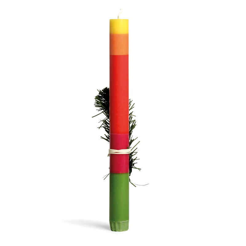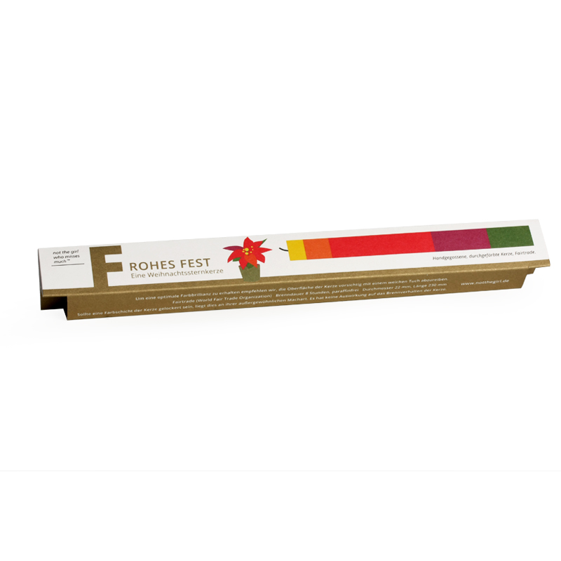 Ein Geschenk, Glückwunsch oder ein Gruß – jedes Thema findet seine passende Kerze, einzeln in einer farbigen Kartonage verpackt. Die Kerze besteht aus durchgefärbtem Wachs – aufwendig wird bei ihrer Fertigung Farbschicht für Farbschicht von Hand gegossen.