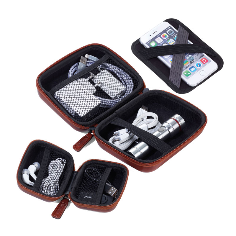 Das Set aus zwei stabilen Hardcover-Etuis steckt alles ein, was mit muss – elektronisches Zubehör, Kosmetikartikel, Reiseaccessoires. Dank zahlreicher Fächer, Netze und Elastikbänder herrscht immer vorbildliche Ordnung, zuhause, unterwegs, überall. Praktisch für Utensilien, Kabel, Kopfhörer, Handy, Netzteile, Medikamente, Kosmetik ... Im leeren Zustand lässt sich das kleine Case platzsparend im großen unterbringen. Kunstleder und Samt in glänzendem braun.