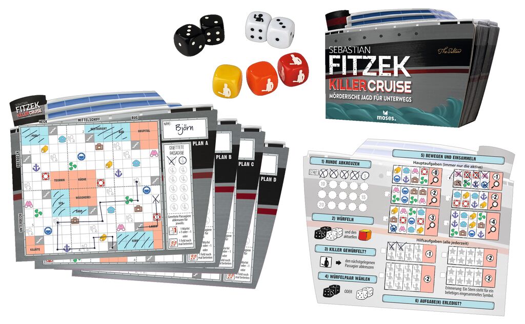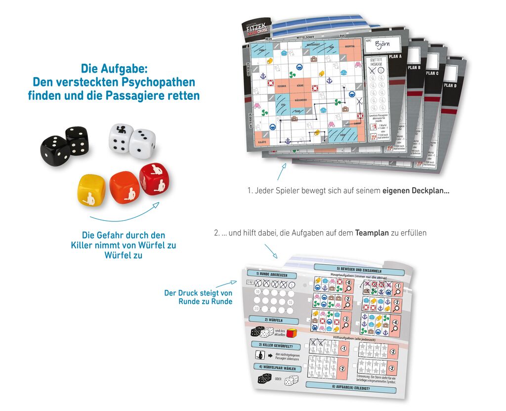 Die spannende Suche nach dem Psychopathen als kompaktes Roll & Write! Die kooperative Würfel-Variante von Sebastian Fitzeks Killercruise bringt die Atmosphäre und den Thrill des großen Bestseller-Brettspiels auf Papier. Ein besonderes Spielerlebnis voller Teamwork, Spannung und kniffeligen Entscheidungen. Dabei sorgen vier unterschiedlich anspruchsvolle Deckpläne für viel Abwechslung in diesem einzigartigen Roll & Write. Die Aufgabe der Spieler: Den versteckten Psychopathen finden und die Passagiere retten. Doch dabei sollte schnell gehandelt werden, denn die Zeit läuft – und das sorgt für extra viel Nervenkitzel, denn die Gefahr durch den Killer nimmt stetig zu…So wird’s gespielt: