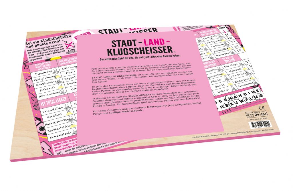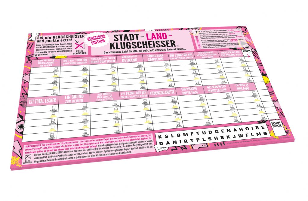 STADT, LAND, KLUGSCHEISSER ist eine tolle und mitreißende Version des Klassikers “Stadt, Land, Fluss”. Ein echter Stimmungsmacher mit sehr hohem Fun-Faktor! In jede der Kategorien muss ein Wort eingetragen werden, das mit einem bestimmten Buchstaben beginnt. Doch darüber hinaus hast Du die Möglichkeit Deine Punkte zu verdoppeln, wenn Du einen einzigartigen Begriff notierst, von dem Du glaubst, dieser sei niemand anderem eingefallen. In diesem Fall einfach das KLUGSCHEISSER-Kästchen neben dem Wort ankreuzen, Daumen drücken und Punkte verdoppeln! Aber no risk, no fun: Sollte hier doch jemand den gleichen Begriff gewählt haben, erhält der KLUGSCHEISSER für die Runde 0 Punkte. Ein kurzweiliges Spiel mit hohem Tempo und dem Extra-Kick!