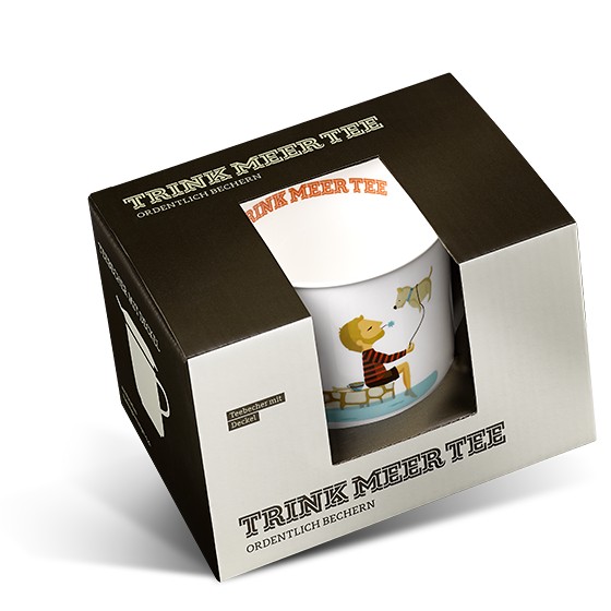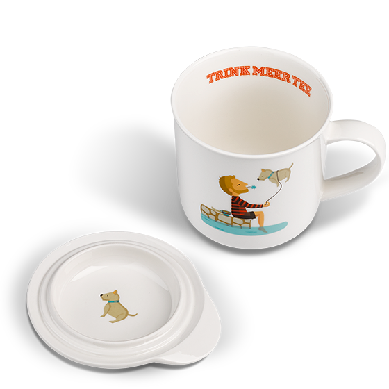 Trink Meer Tee im Lieblingsbecher genießen. In diesem Becher findet eine ordentliche Portion Tee Platz. Das Motiv des Teetrinkers, der seinen Hund fliegen lässt, ist auf der Außenseite eingedruckt. Ein Deckel, der den Tee schön warm hält und umgedreht als Beutel- oder Teesiebablage gehört auch zu dieser tollen Teetasse.