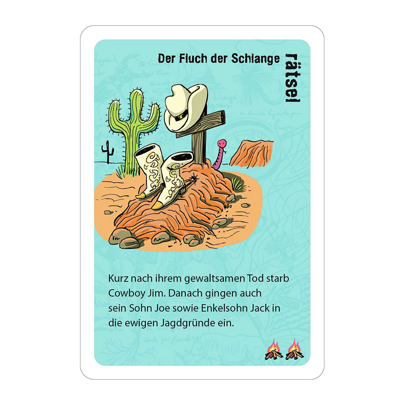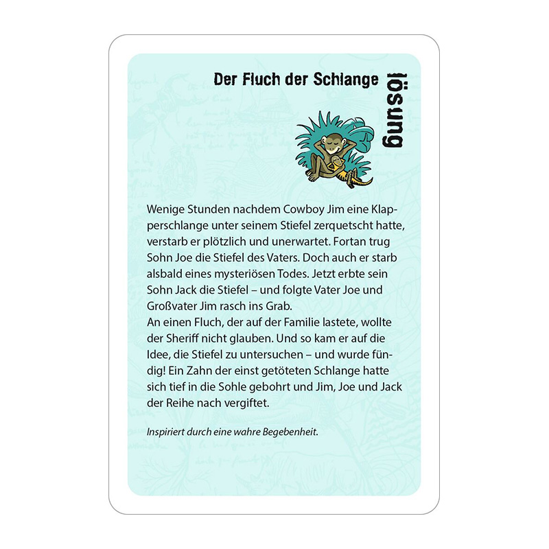Warum freut sich ein Mann trotz zahlreicher Wunden über einen Haiangriff? Wie kann es sein, dass es bei einem riesigen Verkehrsunglück keine Verletzten gab? Und warum drohte Kimo in seinem Zuhause zu verdursten, obwohl es reichlich Wasser gab?Wenn die Sonne erbarmungslos vom Himmel brennt, der Trinkwasservorrat langsam schwindet und man von einer Meute hungriger Hyänen umkreist wird – dann ist Zeit für eine Runde Action. Die adventure stories versammeln 50 gefährlich knifflige Rätsel voller Abenteuer, die auch dem scharfsinnigsten Ratefuchs die Schweißperlen auf die Stirn treiben. Egal, ob kopflose Kakerlaken, hilfreiche Haie oder gefräßige Geier: In diesen nervenaufreibenden Rätselgeschichten passieren haarsträubende Dinge, deren Geheimnisse man nur durch Fragen, Raten und Tüfteln lüften kann. Für alle, die das echte Abenteuer suchen, ist diese black stories Junior Edition genau das Richtige.