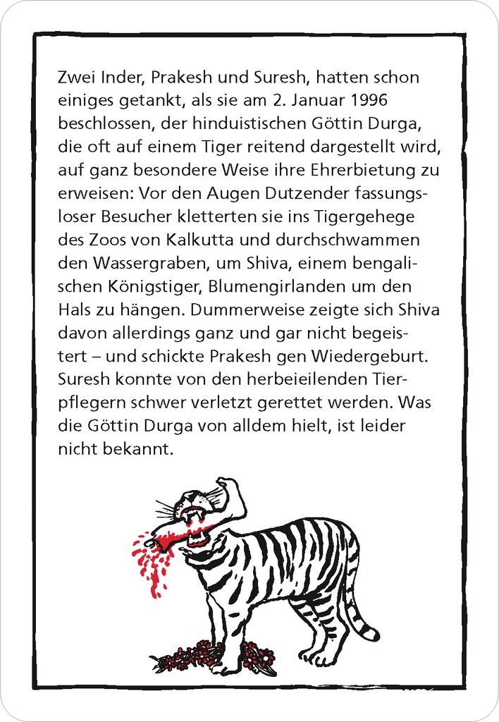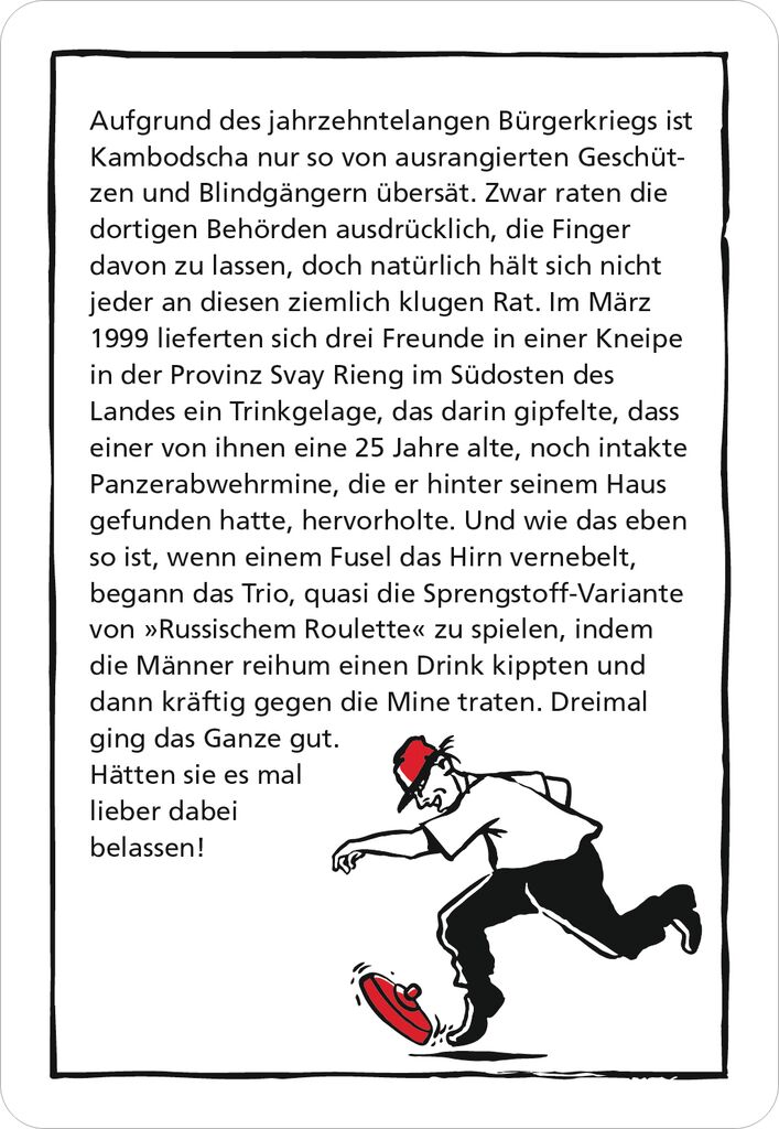 Hier gibt garantiert niemand auf stinklangweilige Weise den Löffel ab! Egal, ob mit Selfie-Stick in der Hand oder Luftgitarre unterm Arm ... Die spektakuläre Methode mancher Trottel, sich selbst ins Jenseits zu befördern, ist häufig – aller Tragik zum Trotz – einfach saukomisch und: Immerhin einer weniger, der mit seiner Beschränktheit die Menschheit in den Untergang stürzen kann. Wer schafft es, die 50 Fälle rund um makabre Missgeschicke zu lösen?Sie sind schwarz, rätselhaft und durch und durch böse: black stories – Das ist DIE Kultreihe bei moses. In den morbiden, gruseligen, erschreckenden und zum Teil unterhaltsamen Rätseln geht es um den Tod und Unfälle, die nicht grauenhafter sein können. Durch Raten sollen genau diese Geschichten dahinter herausgefunden werden. Nicht immer ganz so einfach…