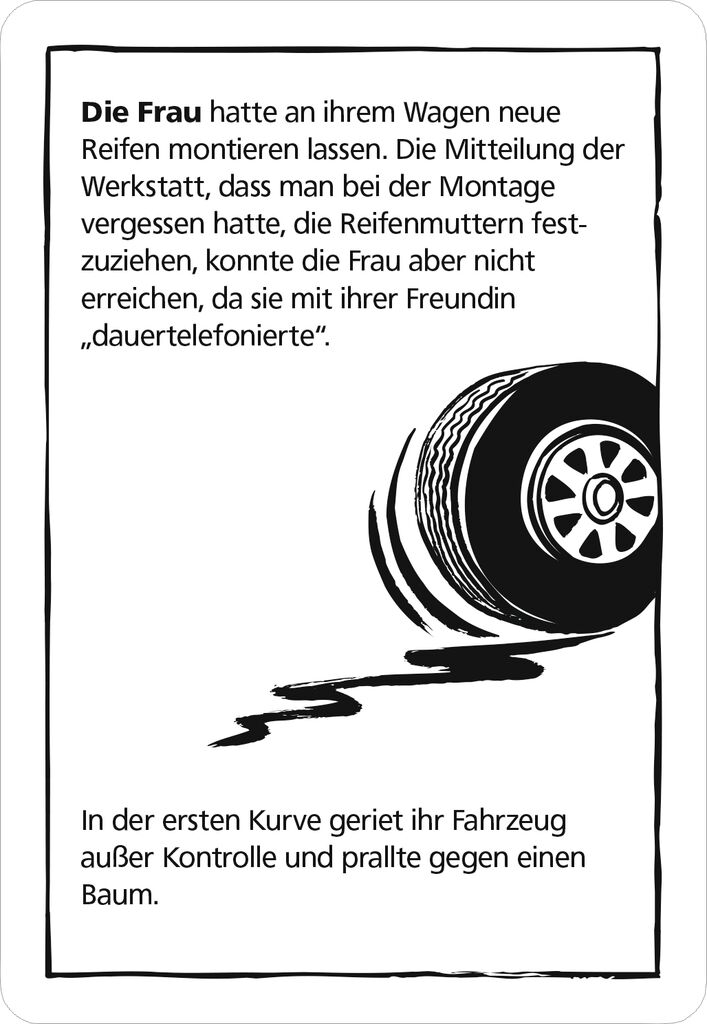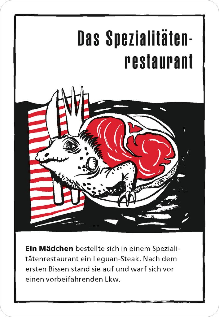 Sie sind schwarz, rätselhaft und durch und durch böse: black stories - Das ist DIE Kultreihe bei moses. und das schon seit über 10 Jahren! In den morbiden, gruseligen, erschreckenden und zum Teil unterhaltsamen Rätseln geht es um den Tod und Unfälle, die nicht grauenhafter sein können. Wie starb der Nackte am Berghang und warum hatte er ein Streichholz in der Hand? Warum freuen sich drei Einarmige über ein Paket mit einem abgetrennten Arm? Weshalb aß die Familie die Großmutter löffelweise auf? Durch Raten soll genau die Geschichte dahinter herausgefunden werden. Nicht immer ganz so einfach…So wird’s gespielt: