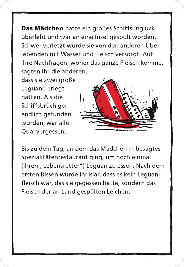 Das Kartenset enthält 50 knifflige, rabenschwarze Rätselkarten für Teenager und Erwachsene, die es durch geschicktes Fragen zu lösen gilt. Am meisten Spaß macht es, black stories zusammen mit Freunden zu knacken. Einer, der Gebieter, nimmt eine Karte aus dem Stapel, liest die kurze Geschichte vor, die auf der Vorderseite der Karte steht. Auf der Rückseite der Karte findet sich die Antwort, die der Gebieter natürlich für sich behält. Nun muss das Ratevolk sich an die Auflösung der Geschichte „heranfragen“. Dabei sollten die Fragen so formuliert sein, dass man sie mit „ja“ oder „nein“ beantworten kann. Ein gruselig-lustiger Ratespass für kleine und große Gruppen – auch digital spielbar.