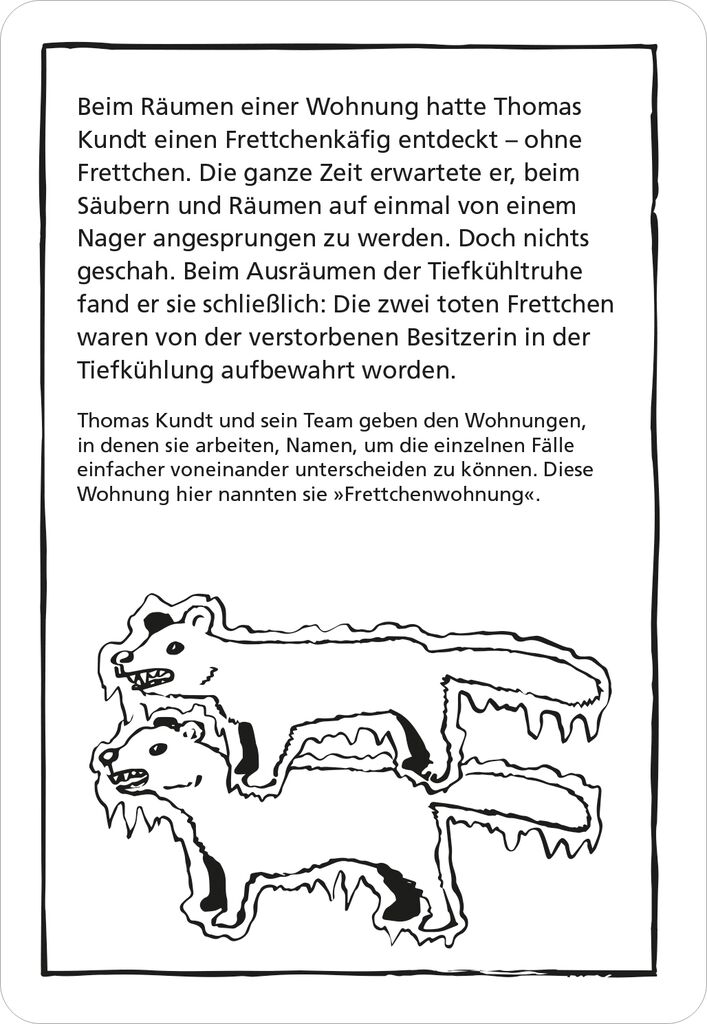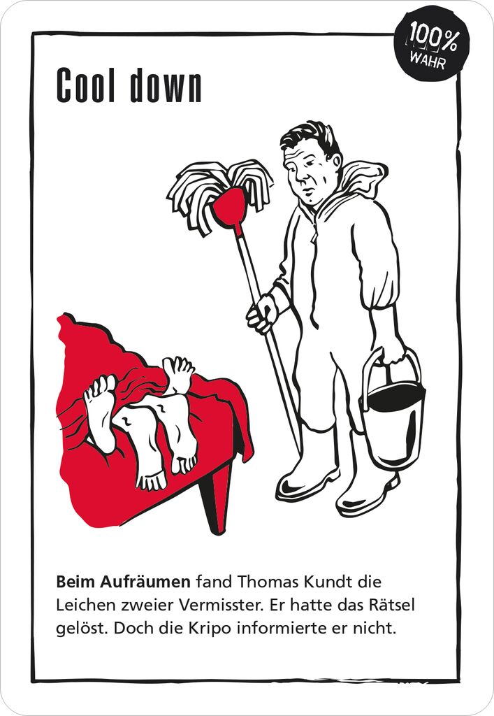 Seine Arbeit beginnt, wenn Polizei und Spurensicherung abrücken... Thomas Kundt ist Tatortreiniger. Ein echter Tatortreiniger. Hinter verschlossenen Türen sieht er Dinge, die für die meisten unvorstellbar scheinen. Und er erlebt tagtäglich skurrile Geschichten, aus denen er nun makabre und rabenschwarze Rätsel kreiert hat, wie nur jemand wie er es kann! 50 rabenschwarze Rätsel von Deutschlands bekanntestem Tatortreiniger rund um Maden, Müll und Leichenschmatze warten in diesem Titel der black stories.Sie sind schwarz, rätselhaft und durch und durch böse: black stories – Das ist DIE Kultreihe bei moses. In den morbiden, gruseligen, erschreckenden und zum Teil unterhaltsamen Rätseln geht es um den Tod und Unfälle, die nicht grauenhafter sein können. Durch Raten sollen genau diese Geschichten dahinter herausgefunden werden. Nicht immer ganz so einfach…