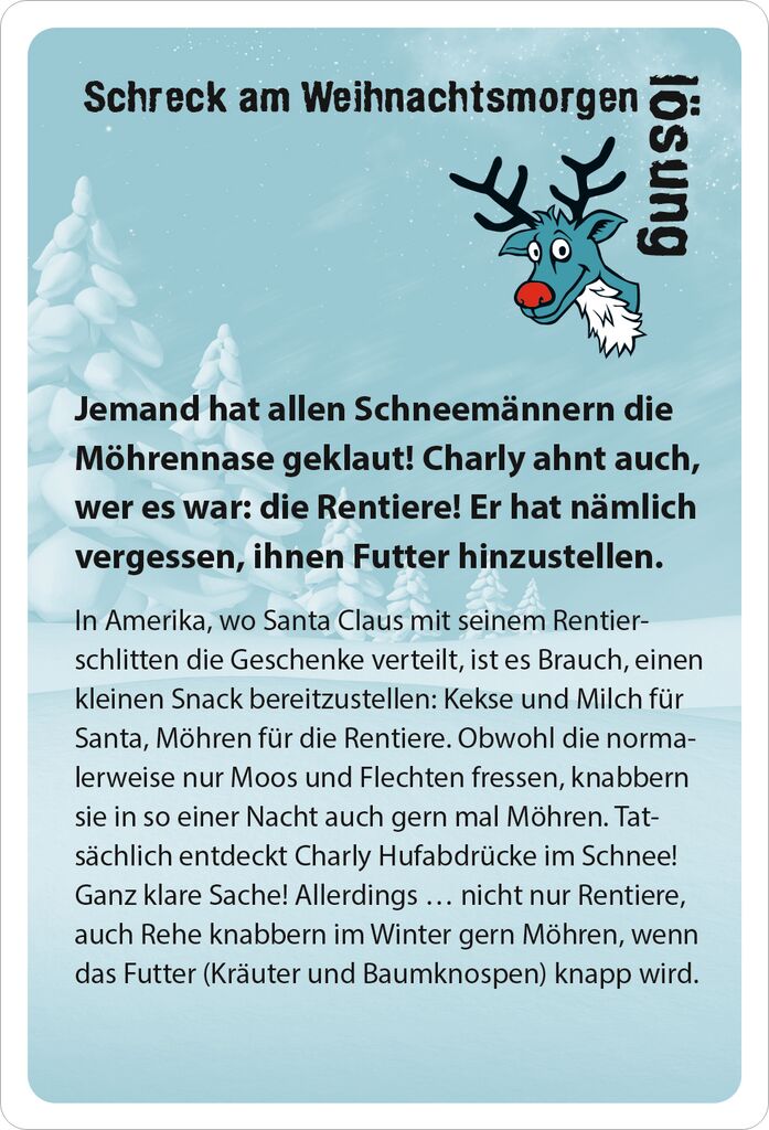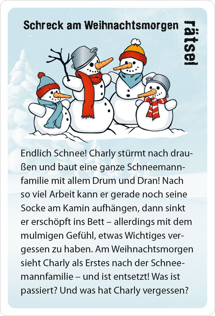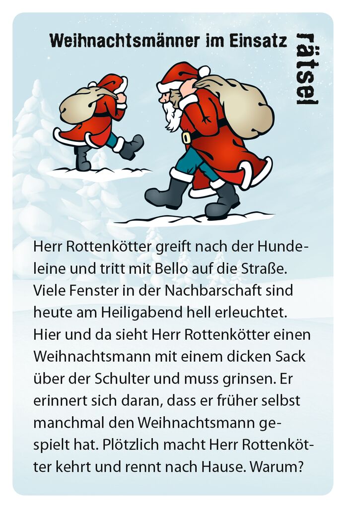 Für alle Kinder, die nicht länger warten können: Advent, Advent, ein Lichtlein brennt, erst eins, dann zwei, dann drei, dann vier … aber Achtung: bevor das Christkindelein seine Locken schwingt und der Weihnachtsmann vor der Türe steht, sind noch einige ganz und gar nicht besinnliche, aber knifflige Rätsel zu lösen. Hervorragend geeignet für knallharte Nussknacker, um die Wartezeit aufs Christkind zu verkürzen!So wird’s gespielt: